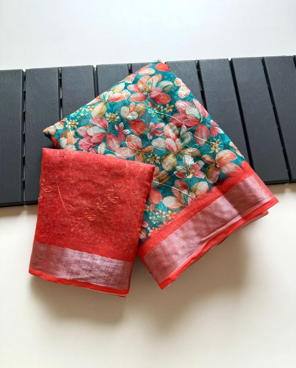 Soft Linen Fabric And Beautiful Floral Print With Silver Jaquard Weaving Border And Embroidery Threading Work In Body With Printed Running Blouse